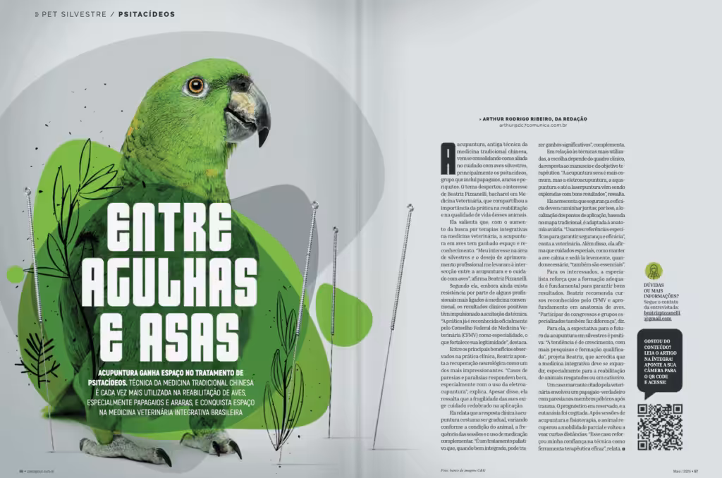 Ela salienta que, com o aumento da busca por terapias integrativas na medicina veterinária, a acupuntura em aves tem ganhado espaço e reconhecimento. “Meu interesse na área de silvestres e o desejo de aprimoramento profissional me levaram à intersecção entre a acupuntura e o cuidado com aves”, afirma Beatriz Pizzanelli.