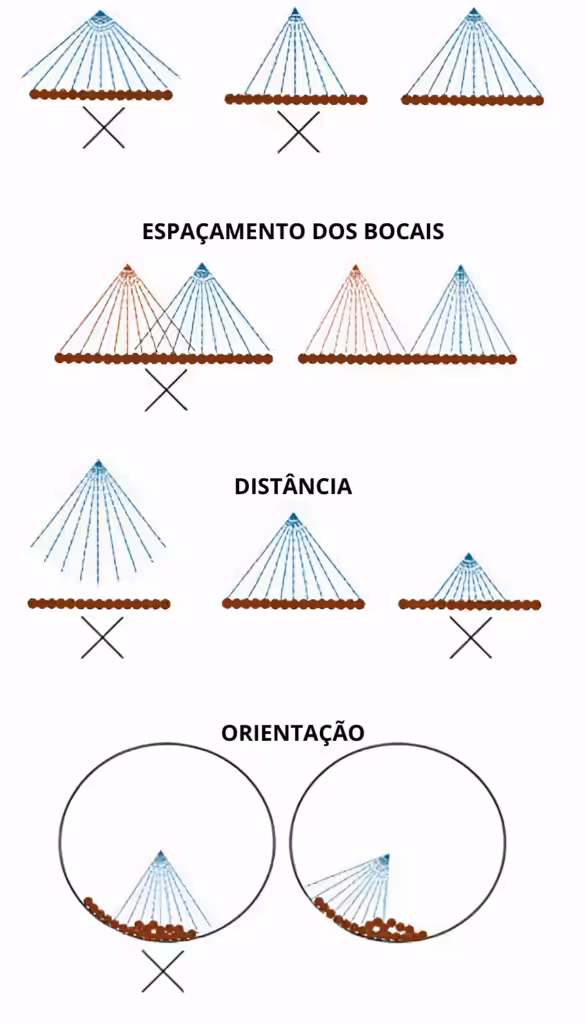 “Os bocais devem ser espaçados adequadamente para evitar sobreposição e garantir cobertura uniforme. Eles também devem ser posicionados suficientemente próximos para atingir os grãos sem perda significativa de líquidos”, explica.