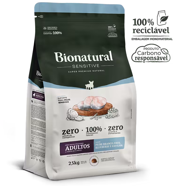Desenvolvido para cães de raças pequenas com peles sensíveis, o alimento no sabor peixe branco, coco, blueberry e ervilha alia tecnologia nutricional, inovação sustentável e rigor científico em um alimento completo, funcional e de alta digestibilidade.