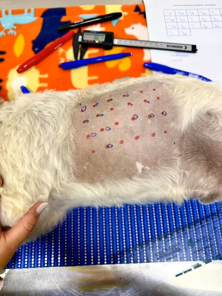 - Prick Test ou teste de puntura: É um método que detecta a quais alérgenos o cão é sensível. É feito na região toracodorsal do animal e não requer anestesia para a realização;